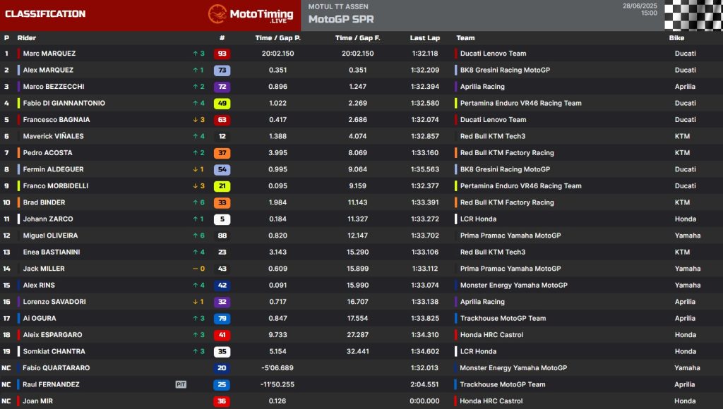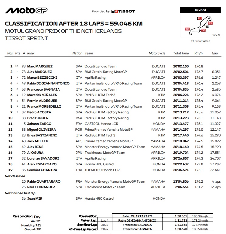 Marc Marquyez larga muito bem e já pressiona o pole Quartararo no início. Porém o francês foi guerreiro tanto quanto pode, porém foi engolido na sequência, e não só por Marc, mas também pore Alex e Bezzecchi. Por fim acabou caindo, pois vinha forçando para manter a P4. Peco Bagnaia teve mais um resultado ruim, ele que além de largar mal não teve ritmo e perdeu várias posições, terminando em P5. Alex chegou em segundo com Bezzecchi garantindo o pódio para a Aprilia.