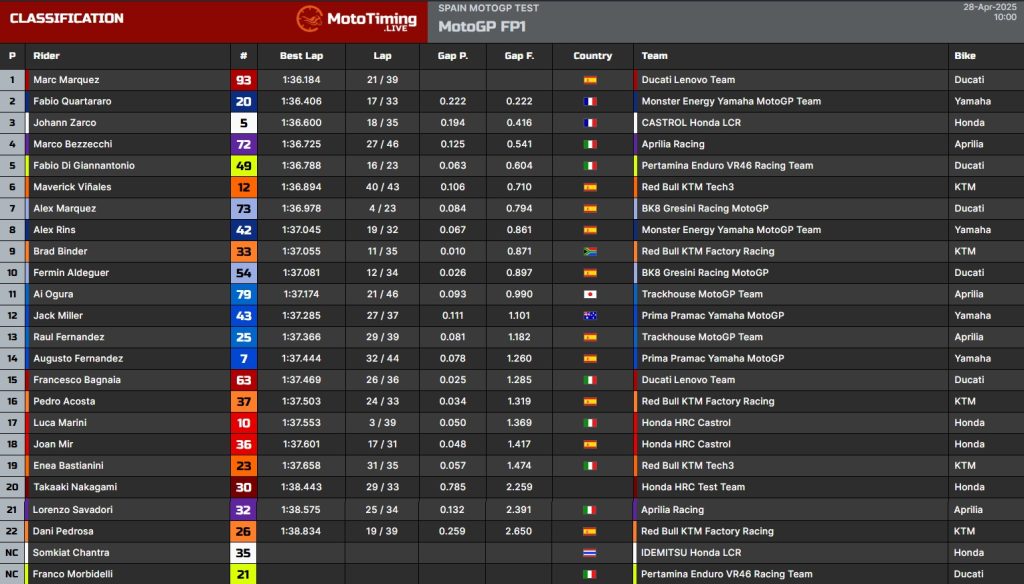 Em toda a Ducati, tratava-se de experimentar novos itens e distribuí-los pelas outras equipes. Marc Marquez (Ducati Lenovo Team) estava no topo pela manhã, mas entrou e saiu da garagem várias vezes. O objetivo de ambos os pilotos era experimentar novos itens, bem como um braço oscilante antigo, mas no lado #93, a sensação de front-end estava no topo, algo programado antes de seu acidente de domingo. O companheiro de equipe Francesco Bagnaia foi um dos primeiros pilotos a chegar à pista às 10h, mas ficou de fora em muitas das primeiras três horas depois do almoço, completando apenas sete voltas antes de voltar nos últimos 90 minutos. Ele estava trabalhando no equilíbrio da Ducati Desmosedici, algo que tem sido o calcanhar de Aquiles ao longo do fim de semana, e ainda no teste, não estava tão feliz quanto o seu companheiro de equipe, que fez o costumeiro P1. No final, o #93 estava no topo em tempos combinados com o único 1’35 do dia, enquanto o #63 de Bagnaia estava dentro e ao redor dos 1’37.4. Mas como sempre falamos aqui, é apenas um teste e cada piloto tem seus objetivos, que pode não ser o tempo. Mas claro que quem está no topo dos tempos, certamente é um bom indicativo de que está tudo certo.