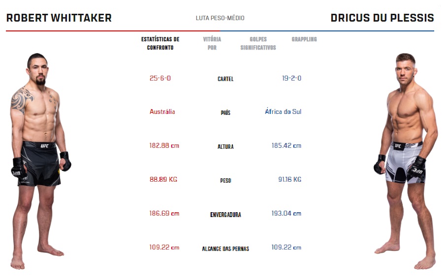 Luta 3: Robert Whittaker x Dricus Du Plessis – Peso Médio – 09/07/2023 – início aproximado no horário de Brasília às 00:20