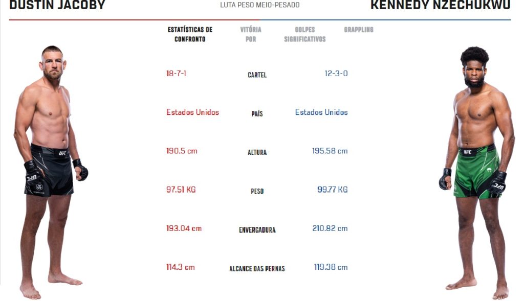 Luta 4: Dustin Jacoby x Kennedy Nzechukwu – Peso Meio Pesado – 06/08/2023 – início aproximado no horário de Brasília às 00:20