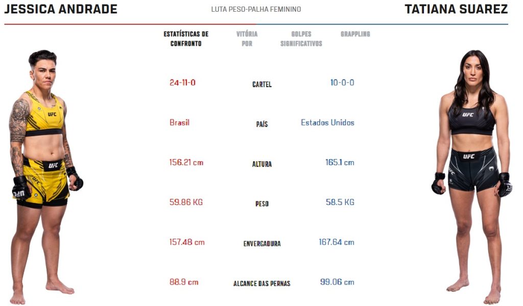 Peso-palha (até 52,1 Kg): Jéssica Andrade (52,3 Kg) x Tatiana Suarez (52,3 Kg)