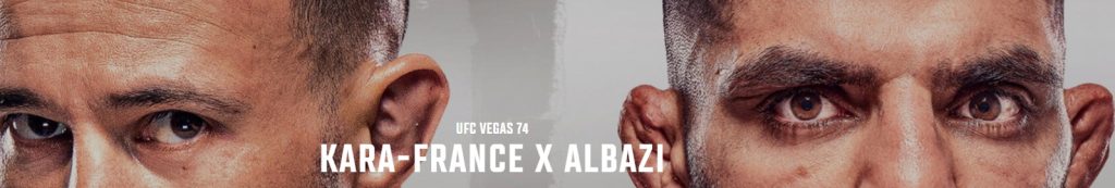 UFCKARA-FRANCE X ALBAZI dia 23.05.2023 no UFC APEX, em Las Vegas, Estados Unidos – Acompanhe as informações no NOSSO CANAL DO YOUTUBE. O CARD PRINCIPAL inicia as 22:00 horas (HORÁRIO DE BRASÍLIA).