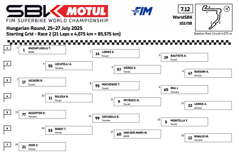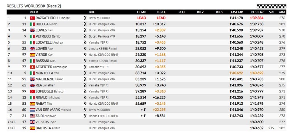 E deu ele, Toprak, o turco, vencendo mais uma e fazendo o hat-trick em Balaton park. São três vitórias nas três corridas, 100% de aporveitamento. No começo da corrida ele até perdeu a liderança, mas o talento logo fez frente aos adversários, levando Toprak a liderança da prova, liderança que não perderia mais, pelo contrário, ele só abriu pra cima dos demais. Vindo da quarta fila, depois de uma difícil Superpole Race, Bulega ultrapassou facilmente seus adversários, porém não conseguiu fazer frente ao principal adversário, o líder do Mundial, Toprak. Sam Lowes, dessa vez conseguiu terminar e acabou em terceiro, fechando o pódio. Bautista teve uma queda feia e abandonou.