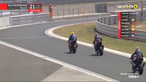A Corrida 1 do Mundial Superbike na Hungria, Balaton Park, começa agItada com bandeira vermelha a partir da curva 2, com 6 pilotos envolvidos.