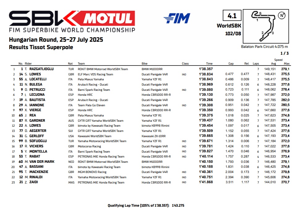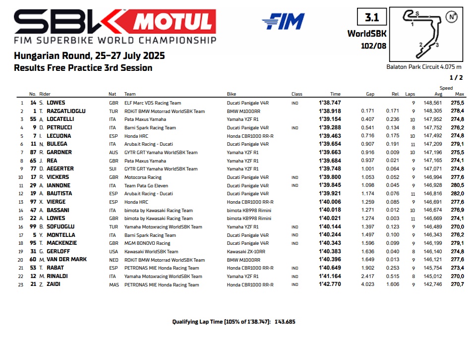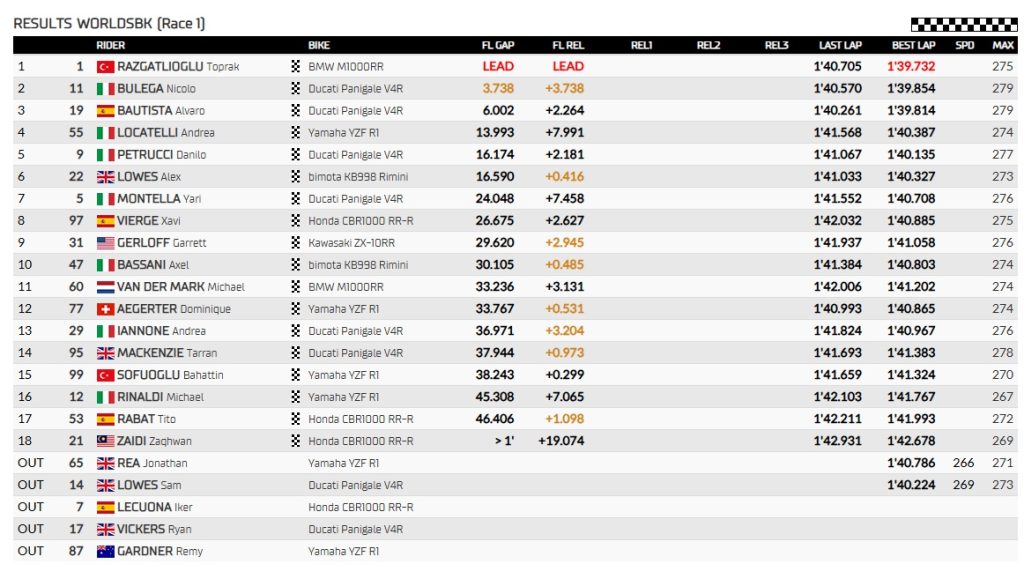 Na sequência tivemos a relargada e deu a lógica: Toprak. Ele mostrou durantes todos os treinos do final de semana que sabe se adaptar bem as novidades, e Balaton é uma pista nova. Pegou a ponta logo no começo e não largou mais. Vitória para o turco e ele certamente é favorito para fazer as 3 vitórias no final de semana. Bulega bem que tentou, demourou um pouco para fazer as ultrapassagens que precisava e chegou em segundo, a 3.7 de Toprak. Bautista fez seu trabalho também e terminou em terceiro. Sam Lowes, incrivelmente, caiu novamente quando brigava pelo pódio. Queda também para Jony Rea, que briga bastante para tentar pegar o ritmo da Yamaha, mas tem sido muito difícil. Outro que caiu foi Lecuona, que fraturou o pulso e está fora no final de semana. Suspeita de concussão para Remy Garder, outro que caiu. Fim de semana complicado. Amanhã teremos a corrida 1000 da história da Superbike, e Toprak poderá fazer história se vencer.