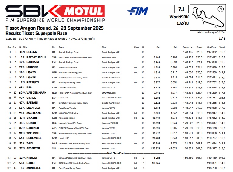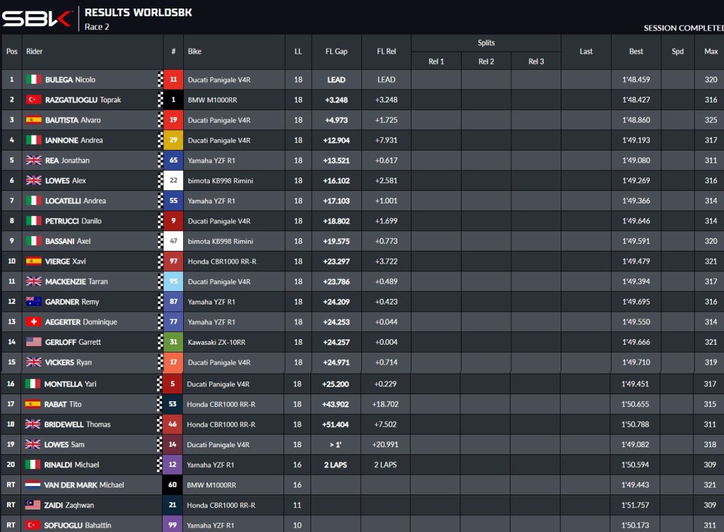Mais uima corrida fantástica vimos na Corrida 2 no Aragão. Trocas de posição em cada volta, assim como foi nas demais corridas no final de semana. Porém, na metade da corrida, Toprak cometeu um erro abrindo demais quando tentou a ultrapassagem, fato que deu a Bulega uma importante vantagem de 1 segundo que Toprak não conseguiu mais recuperar. Vitória tranquila a partir dai para o ducatista. Porém Toprak garantiu a segunda posição que é importante para o campeonato, faltando apenas duas etapas para o final. Baustista chega em terceiro e fecha o podio.