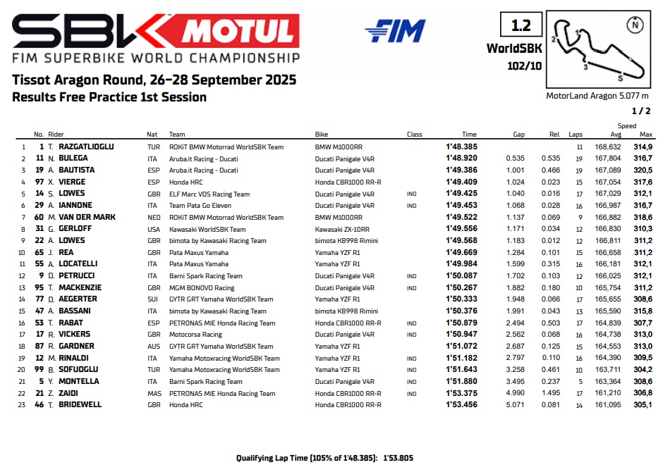 FP1 – Razgatlioglu fica meio segundo à frente de Bulega na abertura do final de semana no Aragão