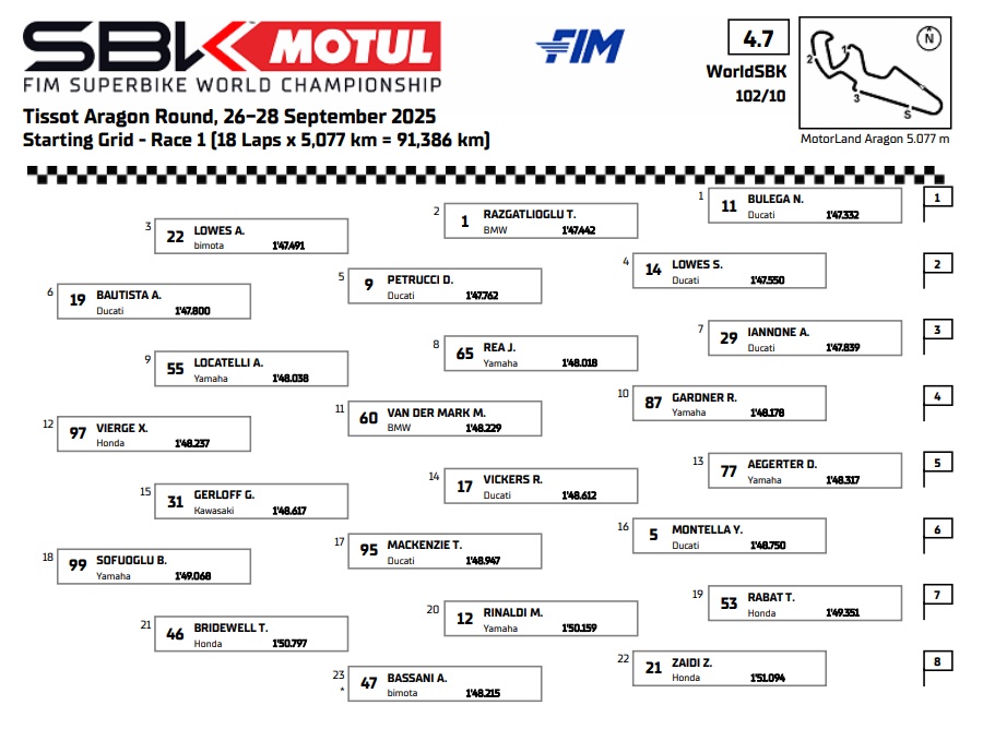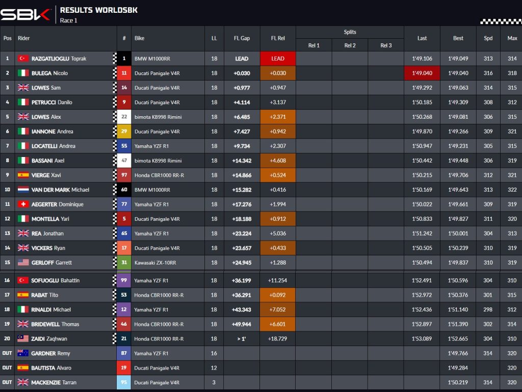 Toprak Razgatlioglu: disse que precisa melhorar a moto para amanhã dando uma resposta estratégica as palavras de Bulega, isso pois são duas corridas e ele espera vencer. Reconheceu que a Ducati estava muito forte.
