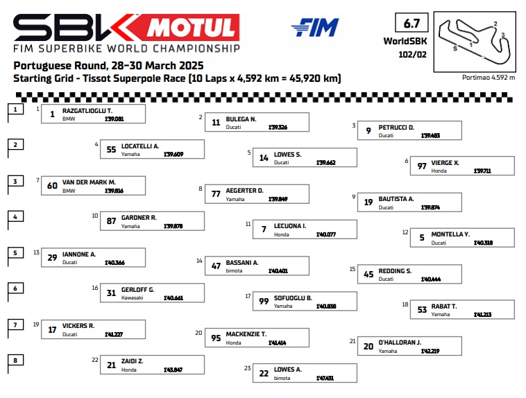 Toprak novamente larga mal, não tão mal como na corrida 1, mas não mantém a P1, que passa para Bulega. Porém após algunas voltas, Toprak já recuperou a posição, nesta pista em que ele domina, conseguindo manter-se a frente com mais facilidade, como diferente do que foi na corrida 1. Por fim, na última volta, Toprak quando vinha tranquilo na liderança, teve um momento de falta de tração, problema comum da BMW, onde Bulega quase aproveitou, porém ficando só no quase novamente como foi ontem, com o Turco fechando bem a porta nas curvas finais. Mas Bulega está aprendendo, conseguirá na corrida 2? Logo saberemos. Toprak garantiu mais uma vitória e vai largar novamente na pole. Veremos como será a Corrida 2 daqui a pouco, corrida onde certamente ele é o favorito pela facilidade que tem na pista portuguesa. Álvaro Bautista, que veio em nono no grid, foi escalando o pelotão, até ultrapassar Petrucci nas últimas voltas, pegando para ele a terceira posição, e assim vai largar na primeira fila na corrida. 2