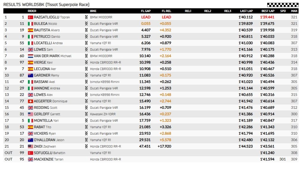 Toprak Razgatlioglu: agradeceu o time pela boa moto, promete dar seu máximo novamente na corrida 2, elogiou Bulega pelo desempenho.
