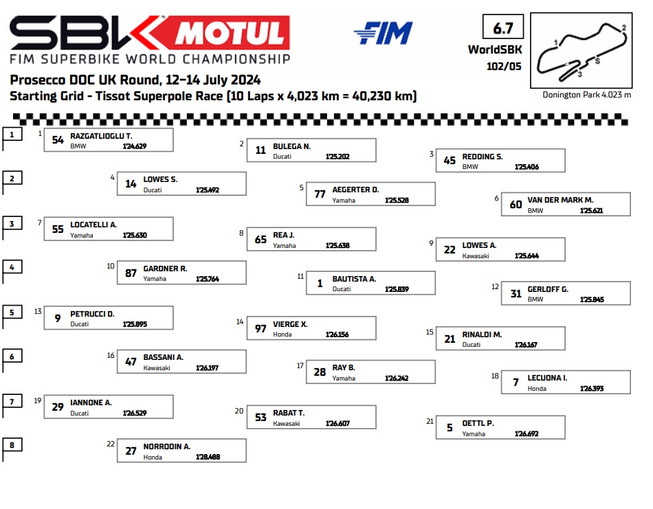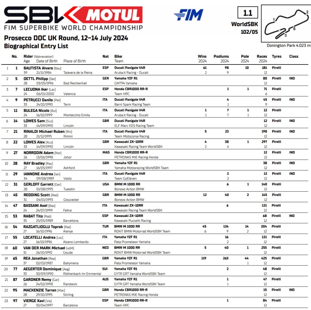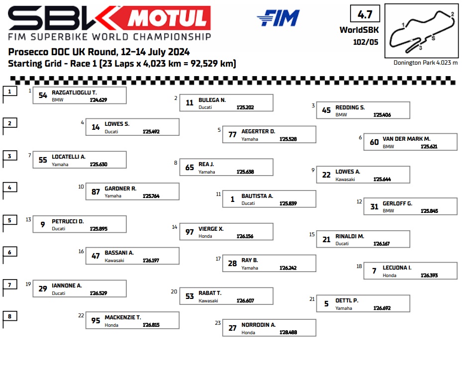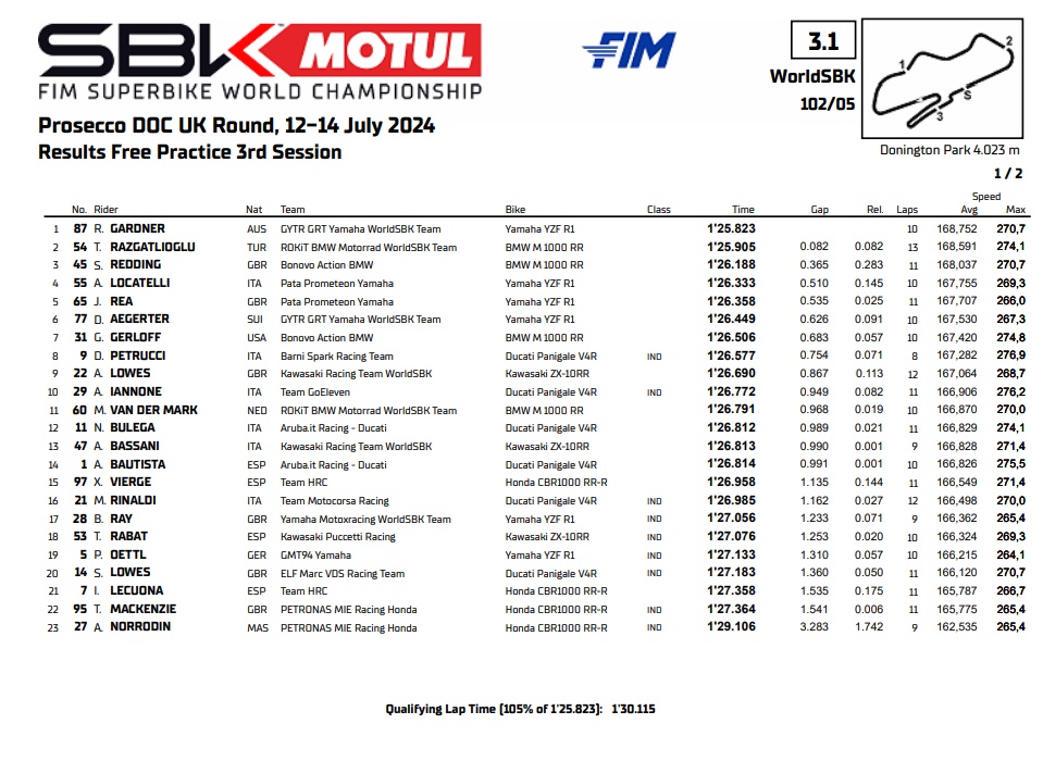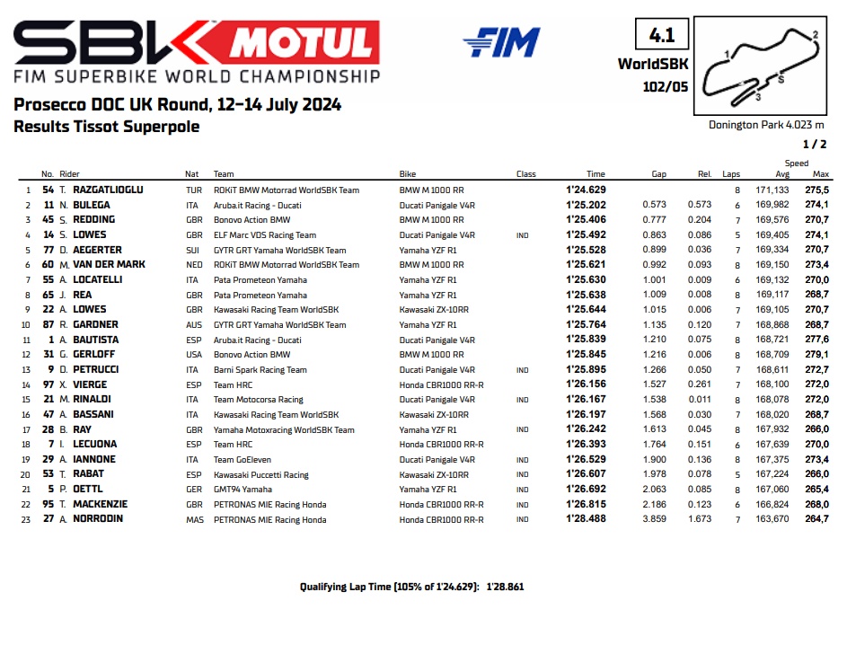 Razgatlioglu permaneceu invicto na sexta-feira em Donington, quando foi direto para a faixa de 1’26, mais de dois décimos à frente de seus rivais da Ducati em um dia em que ele ficou em P1 nos dois treinos livres. Foi um dia forte para a BMW tambem com Scott Redding (Bonovo Action BMW) em quinto lugar, 0,421 s abaixo do seu companheiro de BMW, o Torpak, enquanto Michael van der Mark (ROKiT BMW Motorrad WorldSBK Team) estava entre os dez primeiros no FP1 e ficou em 13o geral. Garrett Gerloff (Bonovo Action BMW) reivindicou 15o depois de um FP1 forte, onde ele estabeleceu um 1’27.052. Petrucci vem forte em segundo, com Bulega na terceira posição, ambos ducatistas. A Kawasaki aparece em quarto, com Lowes. Mas claro que este é apenas o primeiro dia, amanhã teremos a verdade dos fatos e veremos se continua assim ou se teremos mudanças.